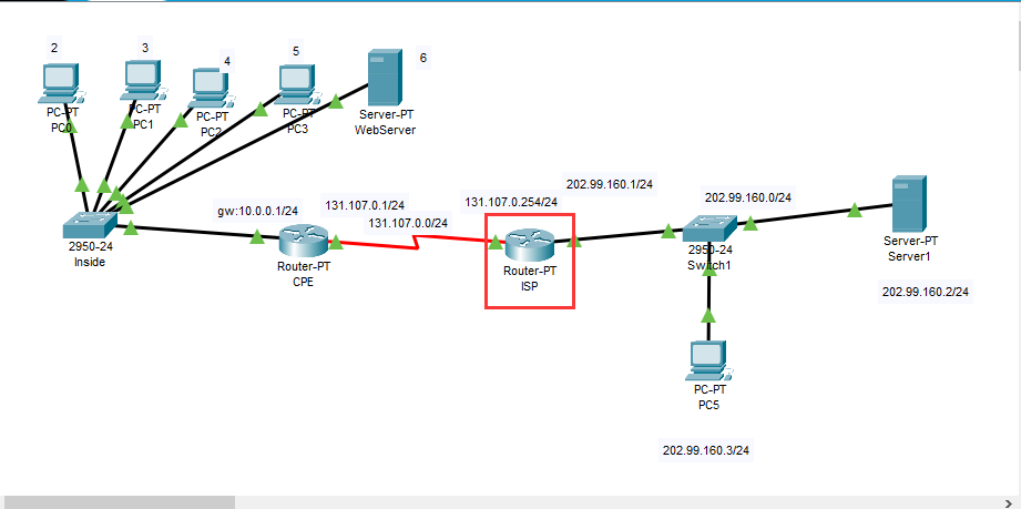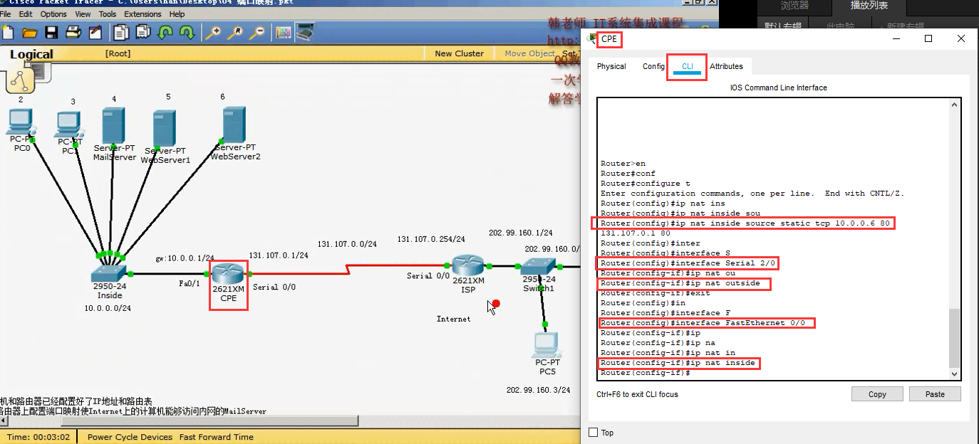Router(config)#ip nat inside source static tcp 10.0.0.6 80 131.107.0.1 80 #1) 配置静态端口映射 指定内网和外网 ,,使用tcp协议 10.0.0.6 80是内网ip和端口,,, 131.107.0.1 80 是外网ip和端口