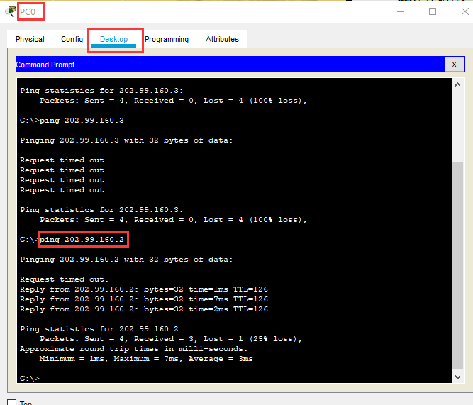 Packets: Sent = 4, Received = 3, Lost = 1 (25% loss),