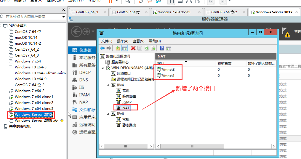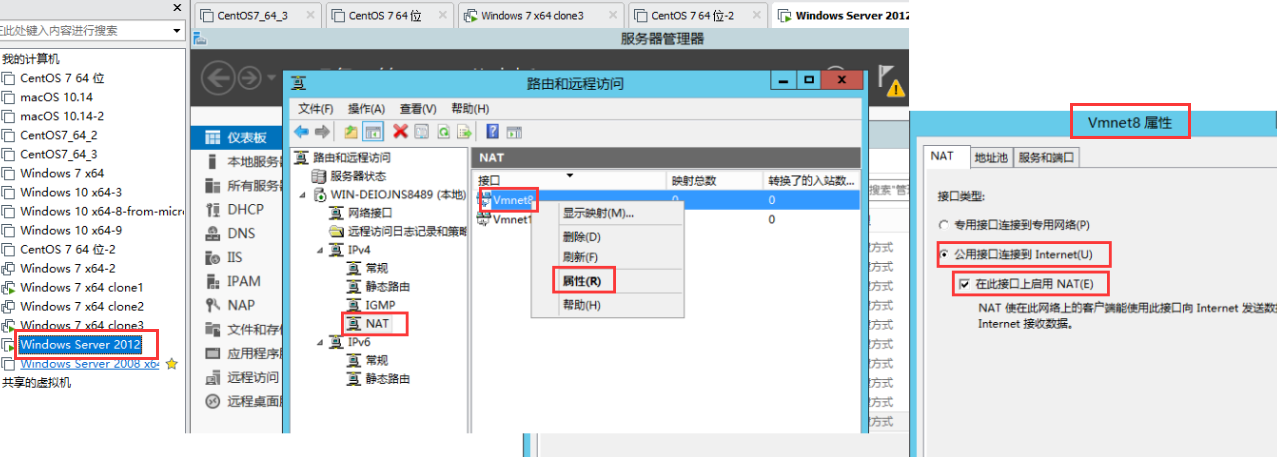 中间两个网卡的电脑(windows server 2012) VMnet8(外网网卡)配置一下静态的端口映射