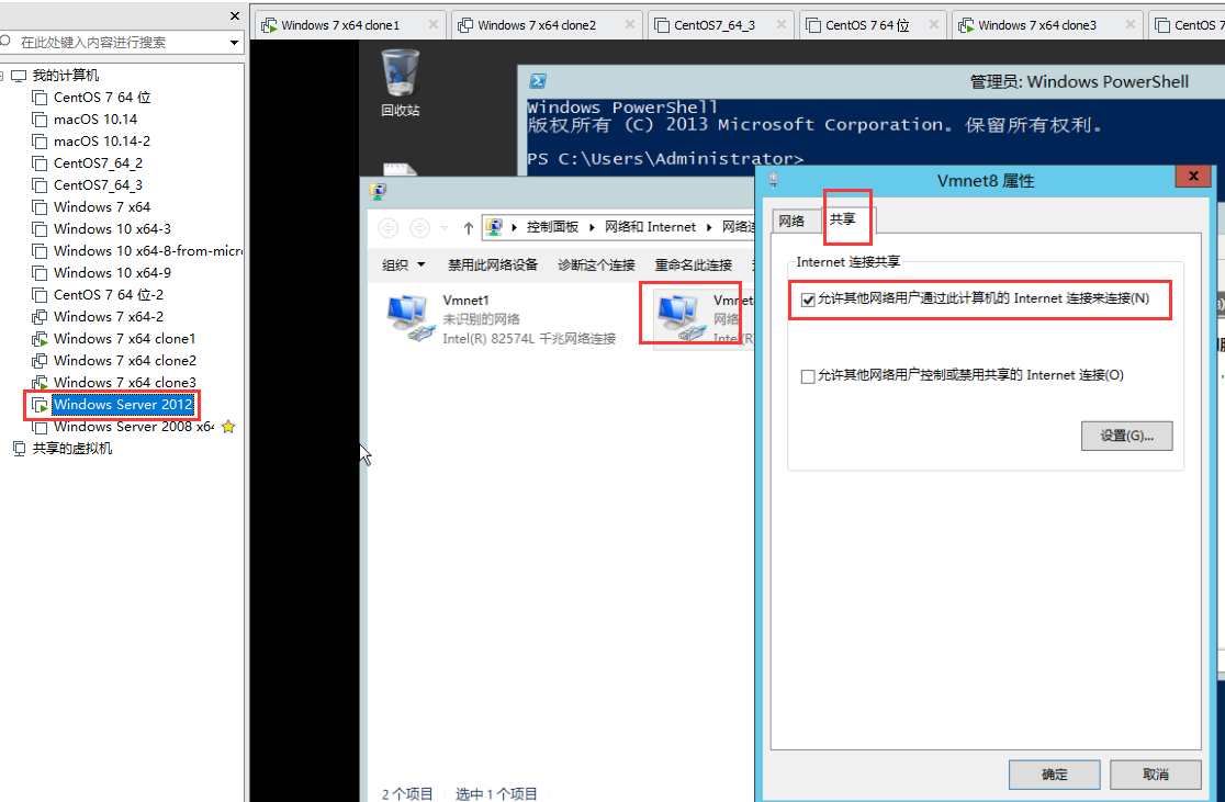 中间两个网卡的电脑(windows server 2012) VMnet8(外网网卡) 去掉连接共享