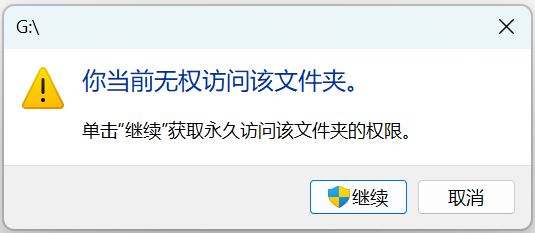 在电脑、U盘或硬盘、USB口都无损坏的情况下,插入U盘后提示“你当前无权访问该文件夹”,文件资源管理器查看文件属性,没有“安全栏”,无法查看或更改此文件夹权限。