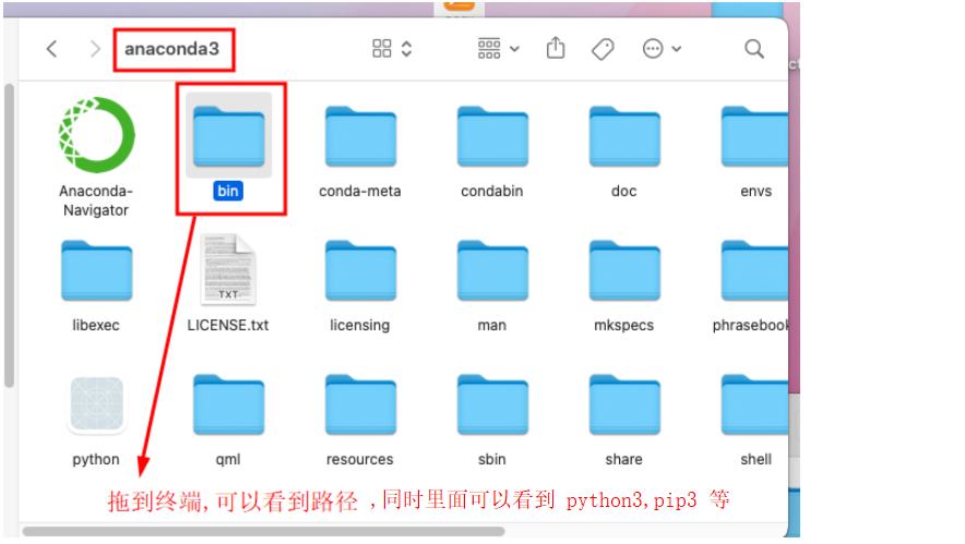 这里 bin 目录里面 可以看到 python3 ,pip3,conda 等等许多命令