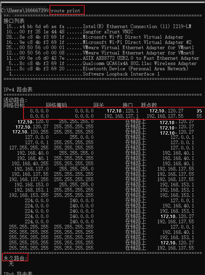 由下图,默认情况下 到 外网是有线网的优先级为 35 ,无线网的优先级为 55 ,,,有线网数值小,更优先