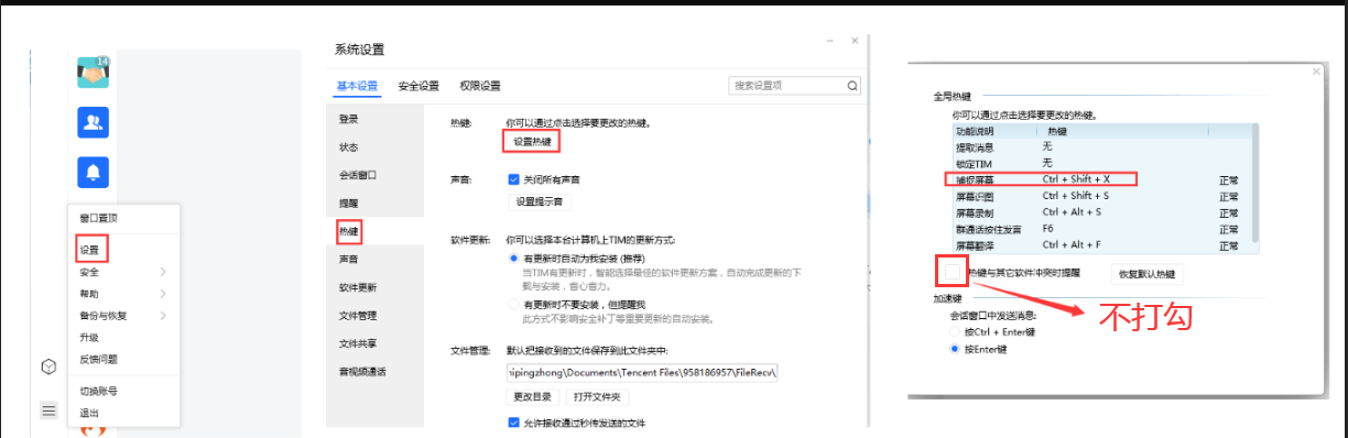 重新启动 TIM,修改截图快捷键为 Ctrl+Shift+X,确认保存。