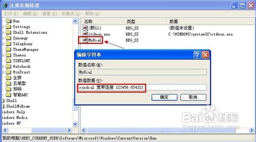 将这个字符串命名为“MyDial”,然后双击打开,在数值数据框中输入“rasdial 宽带连接 123456 654321”(123456代表是你的宽带账号,654321代表的是你的宽带密码),单击“确定”按钮使设置生效