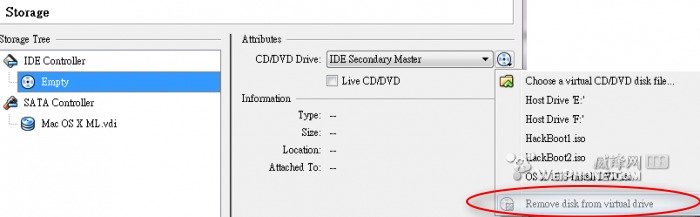 ⑸.12 关闭 Mac OS X 10.8 虚拟机, 在 Storage -> IDE Controller 属性 CD / DVD Drive 右边的光盘图标