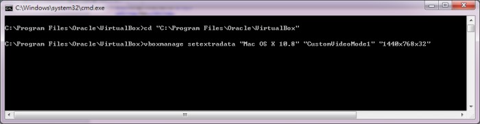 VBoxManage setextradata "Mac OS X 10.8" "CustomVideoMode1" "1440x768x32"