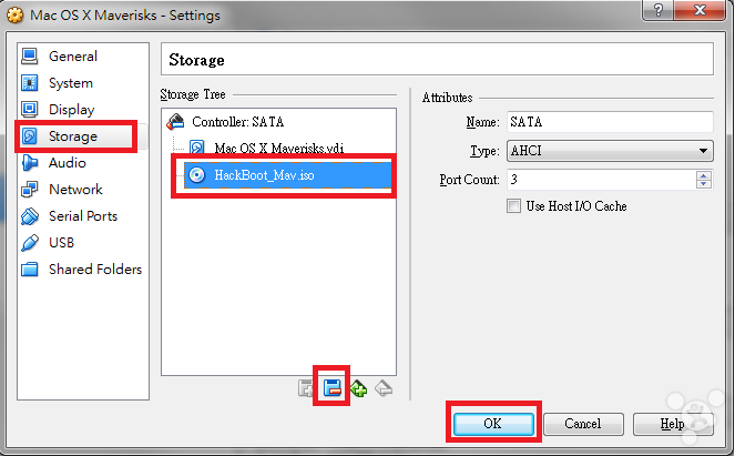 ⑸.4 安装系统成功后, 关闭 Mac OS X 10.8 虚拟机, 在 Storage -> IDE Controller 属性 CD / DVD Drive 右边的光盘图标 Choose a virtual CD/DVD disk file 选择 HackBoot2.iso 文件