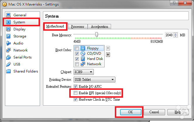 | 本帖最后由 ipod4g 于 2014-3-2 09:57 编辑 建议电脑要求 Windows 7, 32 / 64 bit CPU Intel Core i5 / i7 内存 4GB 以上 硬盘 500GB 以上 由于虚拟机不支持 Apple Quartz Extreme/Core Image, 需要 Quartz Extreme 的应用软件例如 iBooks Author,Pixelmator,SketchBook 等不能在虚拟机下使用 。 安装步骤 ⑴ 下载:http://pan.baidu.com/s/1hqebqYw VirtualBox-4.3.6-91406-Win.exe Oracle_VM_VirtualBox_Extension_Pack-4.3.6-91406.vbox-extpack HackBoot_Mav.iso OSXMavericks2.iso (解压 OSXMavericks2.part1.rar, OSXMavericks2.part2.rar, OSXMavericks2.part3.rar) ⑵ 双击安装 VirtualBox-4.3.6-91406-Win.exe 及 Oracle_VM_VirtualBox_Extension_Pack-4.3.6-91406.vbox-extpack ⑶.1 在 VirtualBOX 新建虚拟电脑 名称 : Mac OS X Mavericks 操作系统 : Mac OS X 版本 : Mac OS X 10.9 Mavericks (64 bit) ![]() ⑶.2 内存分配最少 2048 MB 以上 ![]() ⑶.3 创建新的虚拟硬盘 ![]() ⑶.4 选择 VDI (VirtualBox Disk Image) ![]() ⑶.5 选择 Dynamically allocated ![]() ⑶.6 设置虚拟硬盘位置及大小, 建议大小为 20 GB (最好 40 GB) ![]() ⑷.1 打开 VirtualBOX 虚拟机的设置, 在设置的系统 -> 主板, 去掉 "软驱",取消勾选 "启用 EFI" ![]() ⑷.2 系统 -> 处理器, 选择双核 CPU 数量 = 2 ![]() ⑷.3 显示 -> 显卡 -> 显存大小设置到最大 128 MB 勾选 Enable 3D Acceleration ![]() ⑸.1 在设置的 Storage -> Storage Type 属性 Controller SATA 的光盘图标 Choose a virtual CD/DVD disk file 选择HackBoot_Mav.iso 文件 ![]() ⑸.2 在 HackBoot_Mav.iso 的启动引导下, 如下 OSX Boot 页面出现后,在虚拟机菜单 CD / DVD Drive -> Choose a virtual CD/DVD disk file 选择 OSXMavericks2.iso 文件 ![]() ⑸.3 按键 F5刷新后, 图标标签变为 OS X Base System,回车开始安装系统 ![]() 启动过程可能停在这里一分钟 ![]() ⑸.4 开始时, 选择安装语言 ![]() ⑸.5 安装系统开始时,找不到任何有效的硬盘 , 使用菜单 实用工具 ->磁盘工具 格式化虚拟硬盘 ![]() ⑸.6 左边点选硬盘, 选择 "抹掉", 名称 Name 录入 "Mavericks", 然后点击 Erase 抹掉 ![]() ⑸.7 格式化完毕, 关闭磁盘工具后, 点选 Mavericks 磁盘, 点击 安装 ![]() 安装系统需要 30 分钟以上 ![]() 安装 Mac OS X 系统完毕。 ![]() ⑸.8 安装系统后, 需要重新启动, 虚拟机选 Close 及 Power Off 关闭虚拟机 ![]() ⑸.9.1 关闭 Mac OS X Mavericks 虚拟机后, 在设置的 Storage -> Storage Type Controller SATA 属性 退出OSXMavericks2.iso ![]() ⑸.9.2 CD / DVD Drive 的光盘图标 Add CD/DVD Drive 选择 HackBoot_Mav.iso 文件 ![]() ⑸.10 在 HackBoot_Mav.iso 的启动引导下, 如下 OSX Boot 页面出现后 ![]() ⑸.11 在虚拟机菜单 CD / DVD Drive -> Choose a virtual CD/DVD disk file 选择 OSXMavericks2.iso 文件 ![]() ⑸.12 按键 F5刷新后, OSX Boot 图标标签变为 OS X Base System(绿灯亮),回车再次进入安装系统 ![]() 启动过程可能停在这里一分钟 ![]() ⑸.13 再次进入安装系统,这次选实用工具菜单 -> 终端 ![]() ⑸.14 进入终端, 安装内核扩展,依次输入命令 ![]() ⑸.15 依次输入命令如下:⑸.16安装内核扩展后, 退出终端后, 必须等待虚拟机的硬盘指示灯熄灭, Power Off 关闭虚拟机 ![]() ⑹.1 关闭 Mac OS X Mavericks 虚拟机后, 在设置的 Storage -> Storage Type Controller SATA 属性 CD / DVD Drive 的光盘图标 Add CD/DVD Drive 选择 HackBoot_Mav.iso 文件 ![]() ⑹.2 在 HackBoot_Mav.iso 的启动引导下, 如下 OSX Boot 页面出现后 , 使用右键选择启动 Mavericks (绿灯亮),回车开始启动系统 ![]() ⑹.3 启动 Mac OS X Mavericks 虚拟机文件后, 进入 Mac OS X 设置国家 ![]() ⑹.4 输入用户名称和用户初始密码 ![]() ⑹.5 完成其他安装步骤后,不要启动 iCloud 也不要注册, 并成功进入 Mac OS X 系统 ![]() 如需要更改时区 (左上角的 苹果菜单 -> 系统偏好设置(System Preferences) -> Date & Time) 如需要更改语言 (左上角的 苹果菜单 -> 系统偏好设置(System Preferences) -> Language & Text), 重启后才更新 ⑹.6 在 苹果菜单 -> 系统偏好设置(System Preferences) -> "安全性与私隐" 里面选择 “任何来源” (用于安装 MultiBeast) ![]() ⑹.7 使用 Mac OS X Mavericks 的 Safari, 下载 http://pan.baidu.com/s/1bnb3D9P 及自动解压 MultiBeast-Mavericks-Edition-6.0.1.zip 下载 MultiBeast 6.1 更新 : http://pan.baidu.com/s/1sjCUOGH ⑹.8 自动解压后的文件是在 下载 文件夹里面, 双击 MultiBeast 启动安装 ![]() 点选 Quick Start, 点选 EasyBeast ![]() ⑹.9 点选 Build 及最后点击右下角的 Install 开始安装 ![]() ⑹.10 等待几分钟后,安装完毕后, 在 Mac 关机。 ![]() ⑹.11 Mac关机及关闭 Mac OS X Mavericks 虚拟机后, 打开 VirtualBOX 设置虚拟机, 在 Storage -> Controller SATA 属性退出 HackBoot_Mav.iso 文件 ![]() ⑹.12 及在虚拟机设置的 系统 -> 主板 勾选 "启用 Enable EFI" ![]() ⑹.13 启动虚拟电脑, 会直接启动 Mac OS X Mavericks 虚拟硬盘, 以后并不需要 Hackboot_Mav.iso 光盘文件的引导 ![]() ⑺ 重新启动虚拟电脑后, 可选择挂上磁盘映像 xcode_5.0.1_gm_seed.dmg 安装 Xcode 5 及command_line_tools_os_x_mavericks_for_xcode__late_october_2013.dmg 安装 Command Line Tools ![]() ⑺.1 使用 Mac 的终端, 取消强制 iOS 项目的签名⑺.2 在 Xcode 测试编译适用于iOS的终端 MobileTerminal 项目 下载 MobileTerminal 项目文件夹 : mobileterminal-520-A.zip (234.82 KB, 下载次数: 227) ![]() ⑻.1 本地机器连接到虚拟机, 除了挂上磁盘映像以外, 还有 2 个方案, 方案一 使用SMB 文件共享 在使用这个方案前 必须 虚拟机=>设置=>网络 如下图 但是虚拟机联不上网 |