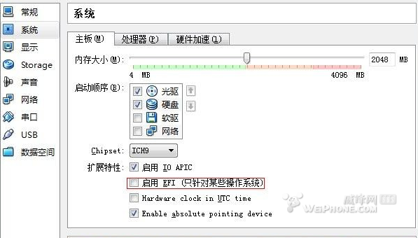 ⑷.1 打开 VirtualBOX 设置虚拟机,系统 -> 主板, 去掉 "软驱",取消勾选 "启用 EFI"