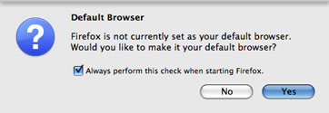 由于 Firefox 不是您的默认浏览器,您也会因此收到一条相关的消息。这意味着当您打开邮件程序中的链接,网站快捷方式或者 HTML 文档时,它不会在Firefox中打开。如果您需要 Firefox 打开它,请点击 ,这样就把 Firefox 设置成了默认浏览器。如果您只是试用一下Firefox,点击 。