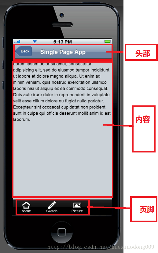 前后都很简单,只有中间部分又很短需要注意的,故再次只介绍中间部分的内容。 首先需要有一个div,并且id必须是afui,然后可以在这个div中间包含,头部,页脚和内容。