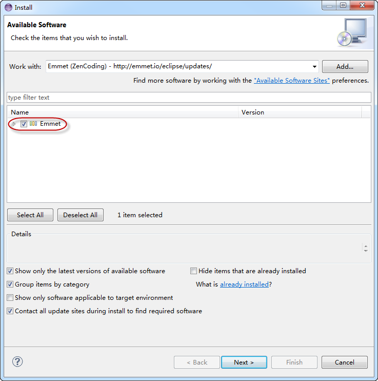 当 Install 对话框中显示出了 Emmet 选择项后,选择 Emmet,一路 Next,到最后一步,选择 I accept the terms of th license agreements,单击 Finish,弹出下载对话框,开始下载必要的组件: