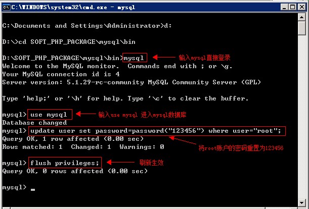 2、另外打开一个cmd窗口, 依次输入以下命令,将root账户密码重置为123456。(命令输入部分用红色标注)