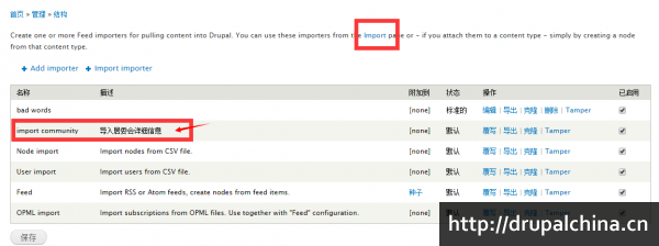 通过地址栏admin/structure/feeds如图打开Feeds的设置界面。单击【Add importer】