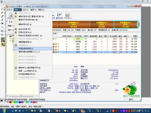 先选中一个逻辑磁盘,比如逻辑磁盘H,再点击“硬盘”菜单,选择“坏道检测与修复”进行检测。如下图所示: