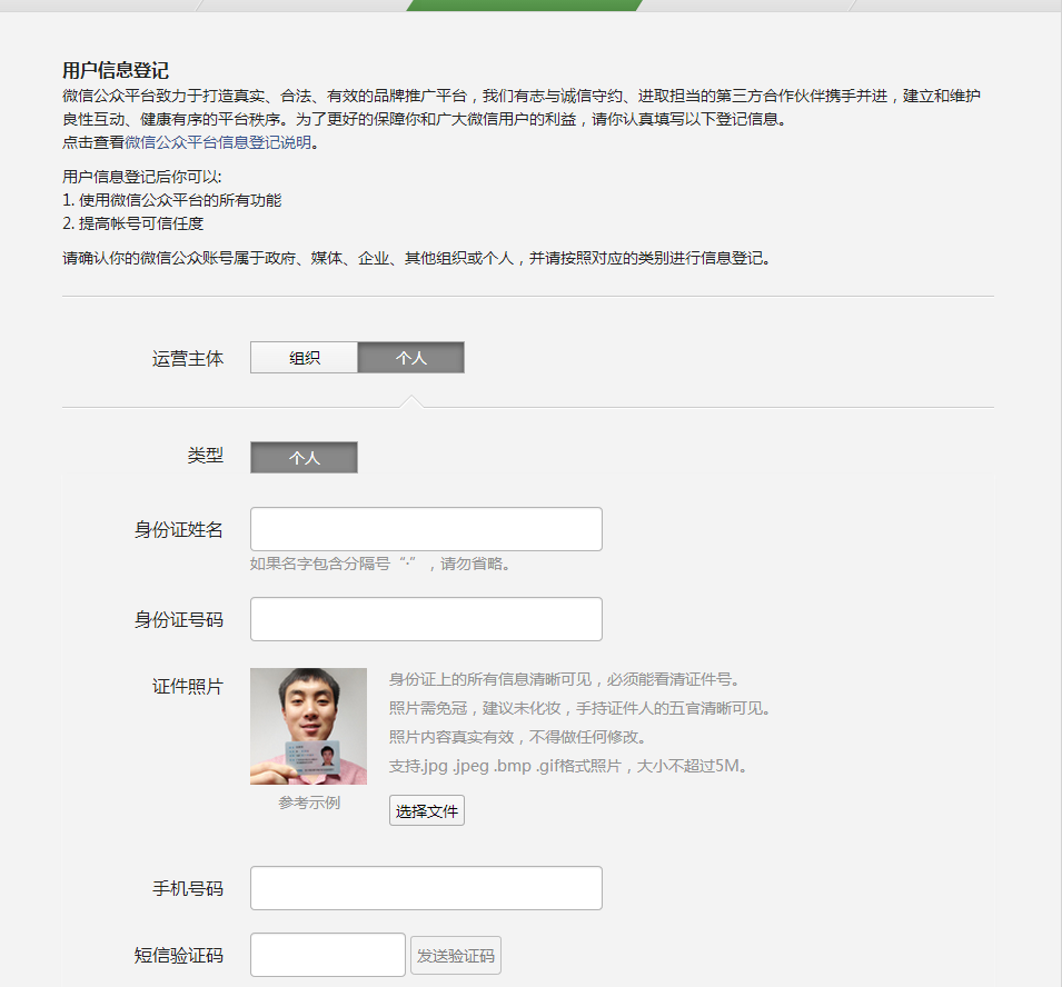需要提供的信息,主要有身份证号码、本人手持身份证的照片,如果是单位注册,还需要单位注册号、营业执照及法人身份证及照片,感觉这个比较变态。哪个老总愿意让你给他和他的身份证合张影呢?