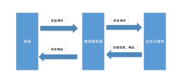 微信服务器就相当于一个转发服务器,终端(手机、Pad等)发起请求至微信服务器,微信服务器,然后将请求转发给自定义服务(这就里就是我们的具体实现)。