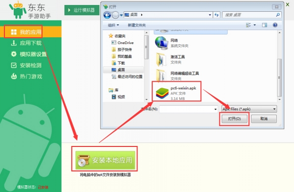 2.东东手游助手安装后点我的应用,安装本地应用。选择刚已下载的安卓版微信