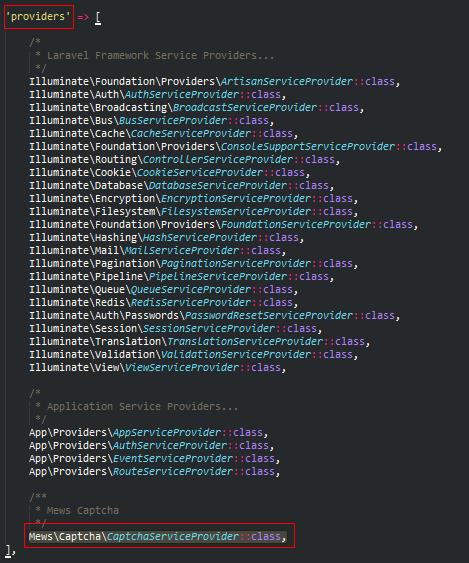 'Captcha' => Mews\Captcha\Facades\Captcha::class,